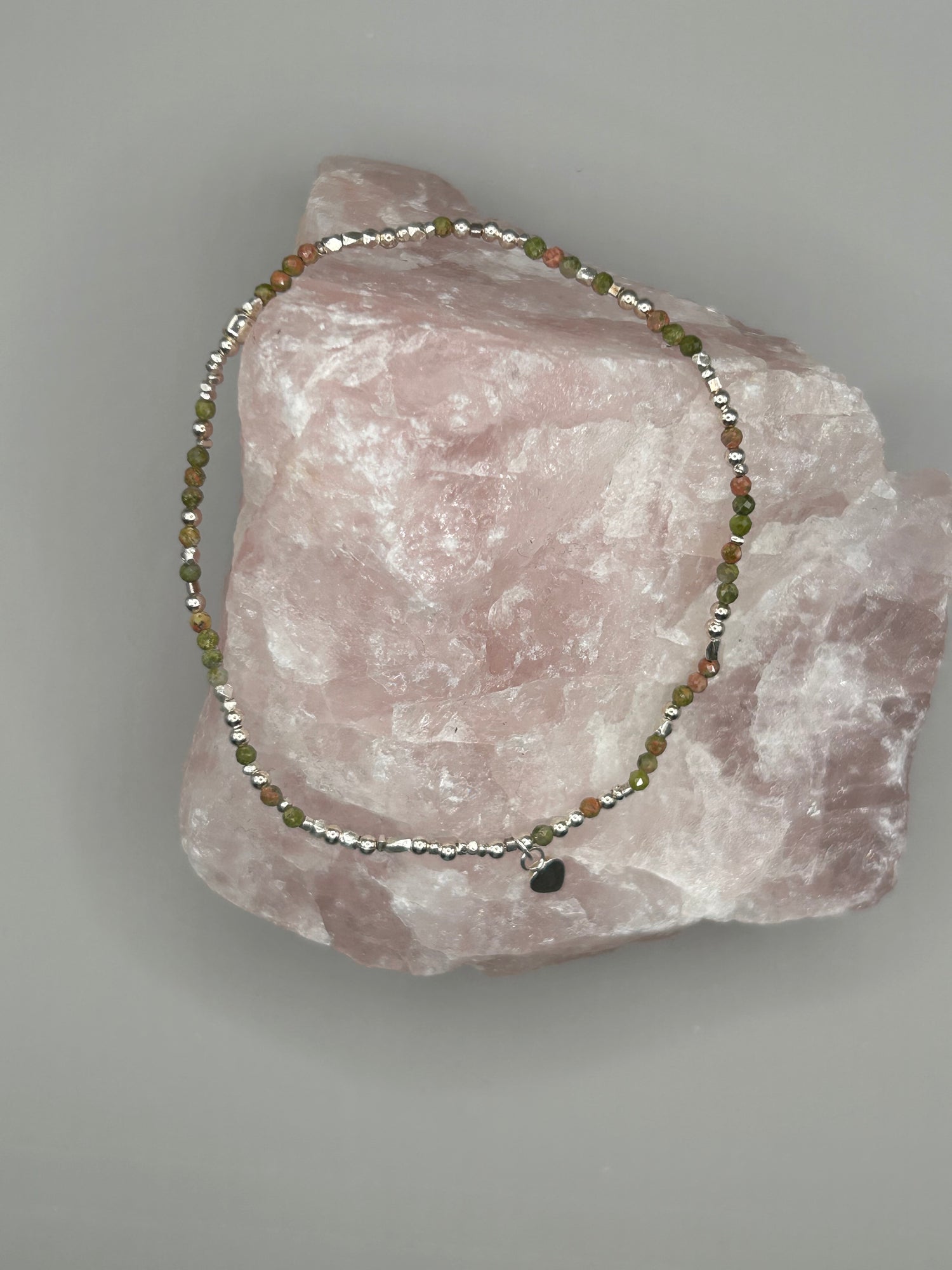 Tiny 1mm faceted stones, tiny Sterling Silver heart dangle charm.